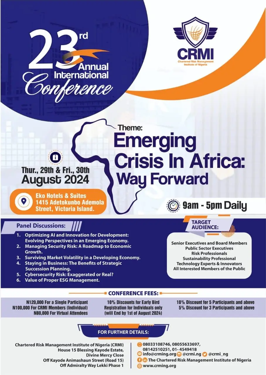 Le Président de SENGOV’RISK, M. Ibnou SOUGOUFARA, représentant l’association composée des plus grands experts en Risk Management au Sénégal, a participé à la 23ème Conférence annuelle sur le Risk Management, qui s’est tenue à Lagos, Nigeria, les 29 et 30 août 2024.